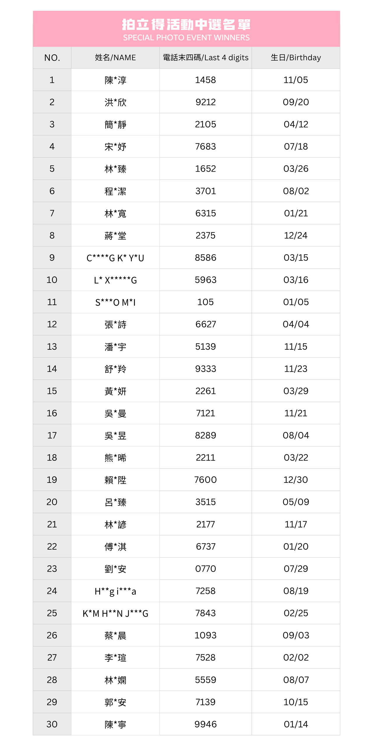 ※The serial numbers in the winner list do not determine the event participation order. Entry will be based on the check-in order on the day of the event. Please follow the instructions of the on-site staff and line up accordingly.