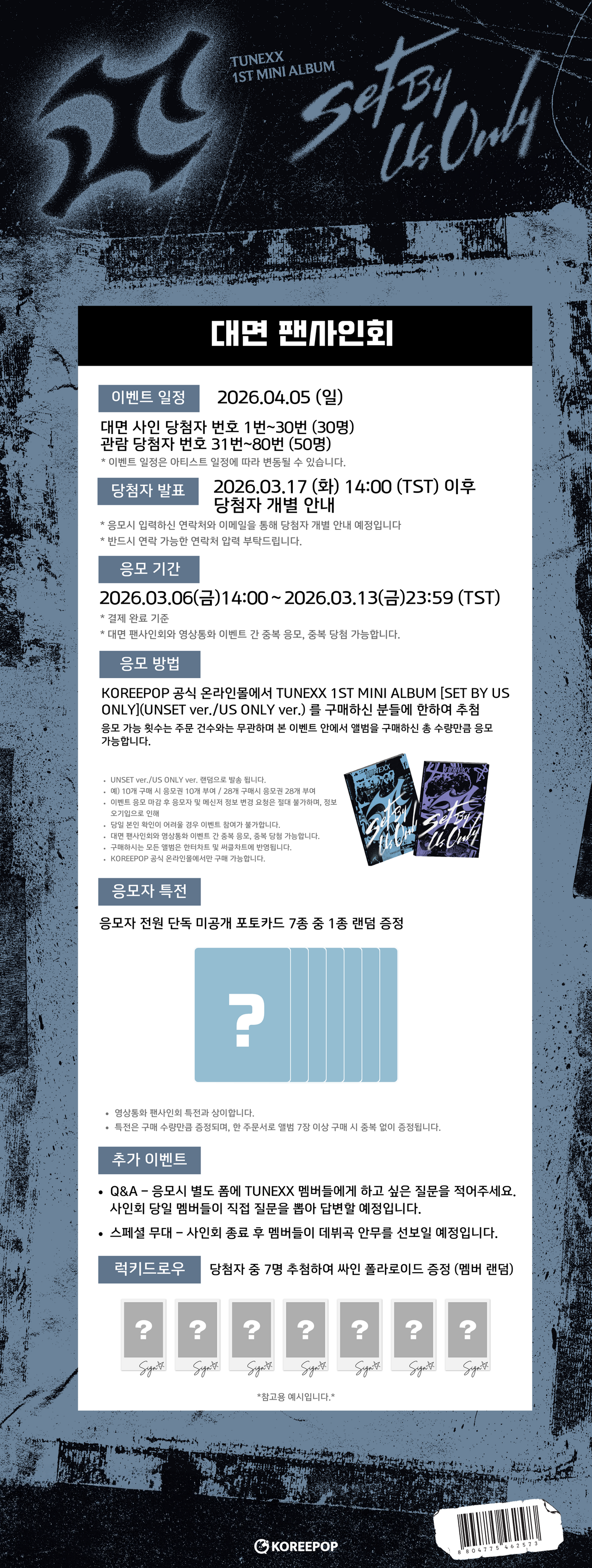 UNSET ver./US ONLY ver. 랜덤으로 발송 됩니다. 예) 10개 구매 시 응모권 10개 부여 / 28개 구매시 응모권 28개 부여 이벤트 응모 마감 후 응모자 및 메신저 정보 변경 요청은 절대 불가하며, 정보 오기입으로 인해 당일 본인 확인이 어려울 경우 이벤트 참여가 불가합니다. 대면 팬사인회와 영상통화 이벤트 간 중복 응모, 중복 당첨 가능합니다. 구매하시는 모든 앨범은 한터차트 및 써클차트에 반영됩니다. KOREEPOP 공식 온라인몰에서만 구매 가능합니다.