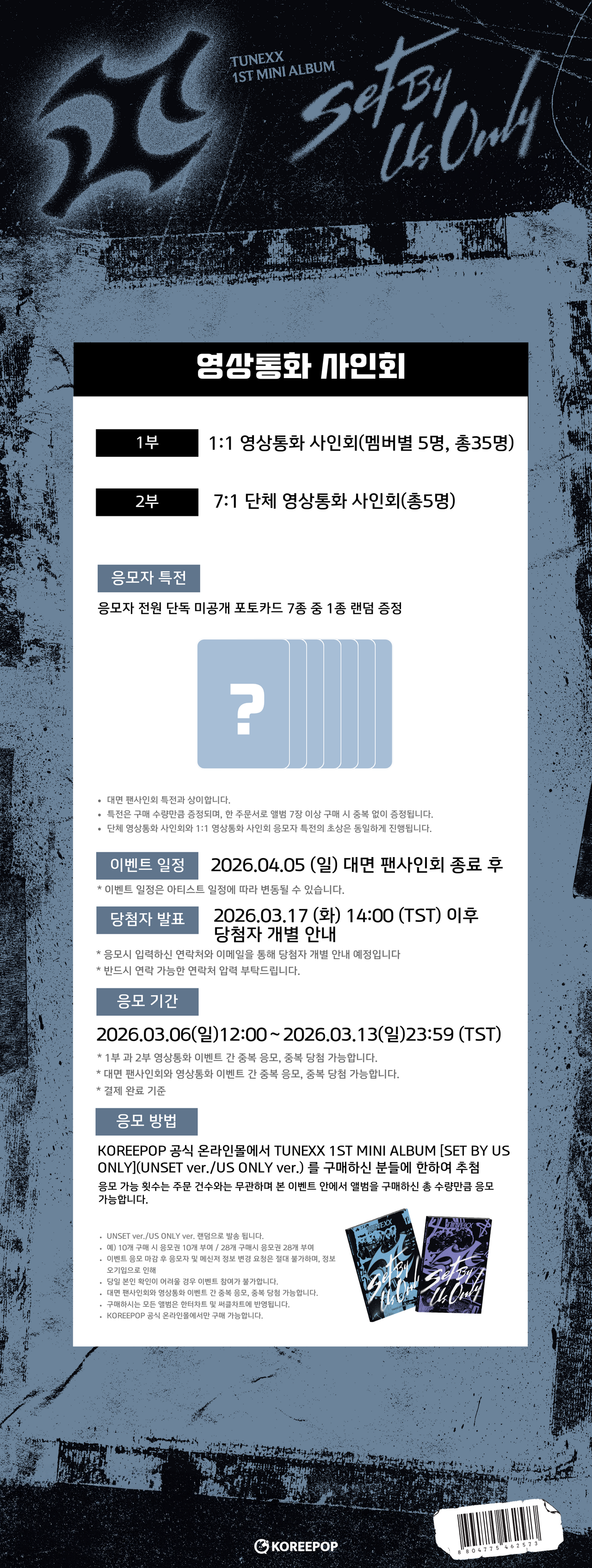 UNSET ver./US ONLY ver. 랜덤으로 발송 됩니다. 예) 10개 구매 시 응모권 10개 부여 / 28개 구매시 응모권 28개 부여 이벤트 응모 마감 후 응모자 및 메신저 정보 변경 요청은 절대 불가하며, 정보 오기입으로 인해 당일 본인 확인이 어려울 경우 이벤트 참여가 불가합니다. 대면 팬사인회와 영상통화 이벤트 간 중복 응모, 중복 당첨 가능합니다. 구매하시는 모든 앨범은 한터차트 및 써클차트에 반영됩니다. KOREEPOP 공식 온라인몰에서만 구매 가능합니다.